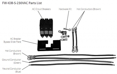 Product No. I1328 Includes: Three 30A 230VAC single pole PANEL mount breakers, sliding bypass interlock plate, wire and hardware kit System Rating Single-Phase 230VAC 30A 6.9kW Bypass Breaker One Pole @ 30A 6.9kW Input Breaker One Pole @ 30A 6.9kW Output Breaker One Pole @ 30A 6.9kW -