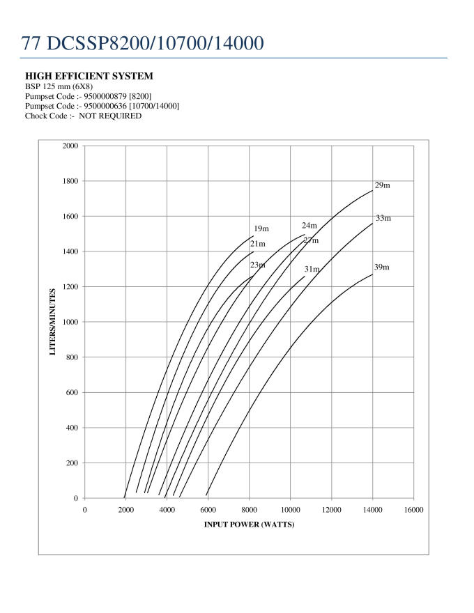 (A) Input Power (Watt) [hidden] [hidden] [hidden] [hidden] [hidden] [hidden] 8200 7200 6200 4200 2900 2500 2100 Head (m) Flow in LPM [hidden] [hidden] [hidden] [hidden] [hidden] [hidden] 23 1285 1145 930 760 0 21 1415 1295 1068 689 260 0 19 1508 1379 1221 776 450 260 0 (B) Input Power (Watt) [hidden] [hidden] [hidden] [hidden] [hidden] [hidden] 10700 9500 8500 6500 4300 3600 3100 Head (m) Flow in LPM [hidden] [hidden] [hidden] [hidden] [hidden] [hidden] 31 1285 1087 959 629 0 27 1470 1272 1151 818 338 0 24 1599 1431 1280 931 467 274 0 (C) Input Power (Watt) [hidden] [hidden] [hidden] [hidden] [hidden] [hidden] 14000 12000 10000 8000 5900 4600 4000 Head (m) Flow in LPM [hidden] [hidden] [hidden] [hidden] [hidden] [hidden] 39 1285 1040 848 570 0 33 1570 1301 1040 819 401 0 29 1745 1502 1300 940 640 240 0 2 year warranty