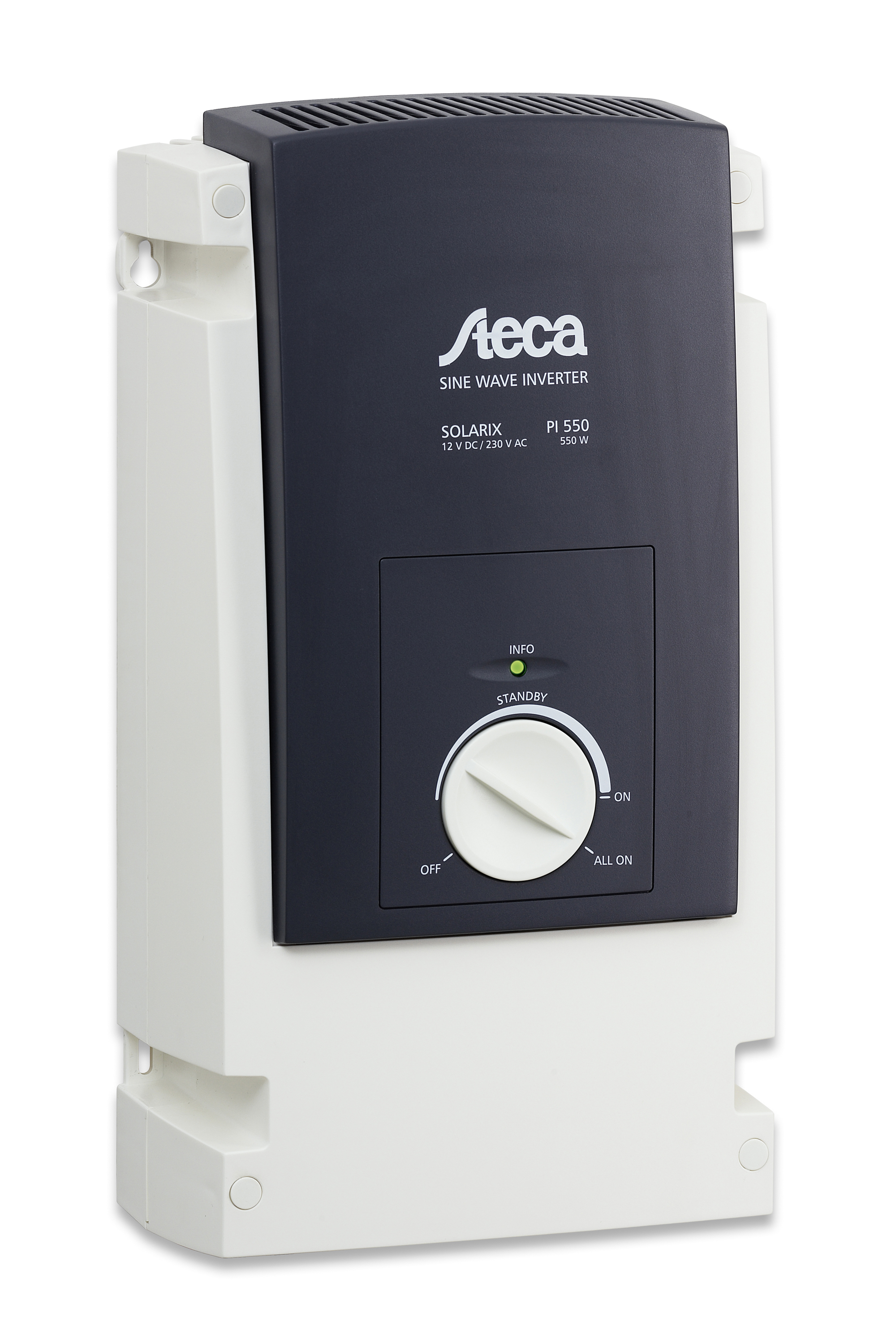 In developing the Solarix PI sine wave inverter, Steca has brought about some innovations which are unprecedented in this form. These are, above all, parallel connection, the novel operating concept which uses a single rotary switch, direct communication in order to calculate the state of charge (SOC) with Steca Tarom and Steca Power Tarom, and the electronic fuse. Furthermore, our many years of experience have come into play for deploying these inverters specifically in photovoltaic systems. This comes through, for instance, in the way that a most diverse range of appliances is provided with a low operating consumption and a stable energy supply.